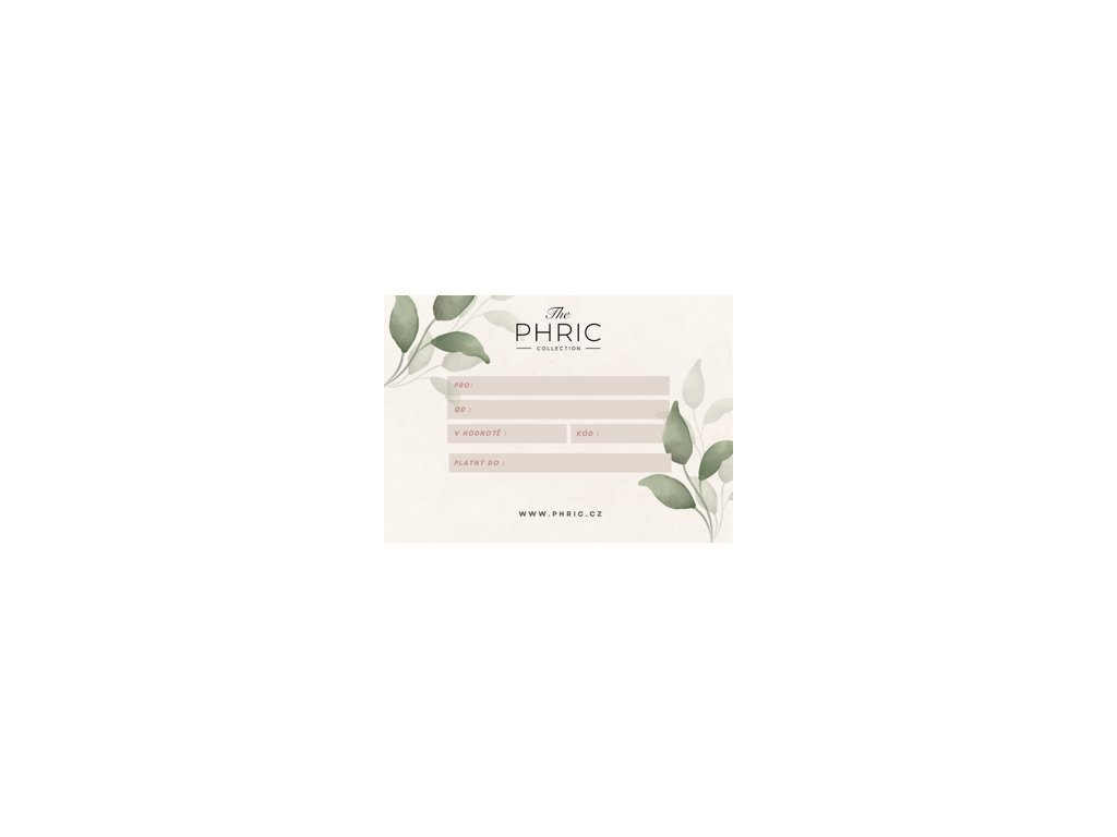 Dárkový poukaz PHRIC je elegantní a vždy bezpečná volba, pokud chcete obdarovat někoho, komu chcete dopřát kvalitní vůně, kosmetiku a designové doplňky. Stačí zvolit hodnotu, která vám vyhovuje – 500 Kč, 1000 Kč, 1500 Kč nebo 2000 Kč – a nechat radost na obdarovaném.